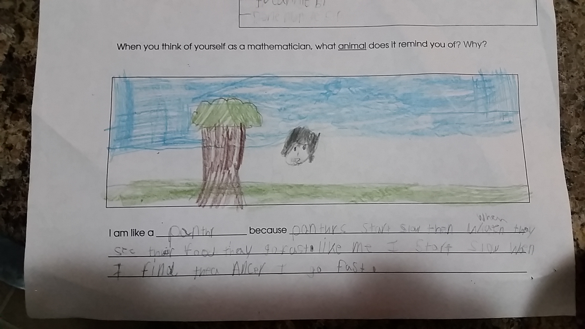 School Note and Project I am like a Panthr (Panther) because panthrs start slow then when they see their food they go fast like me. I start slow when I find the ancer (answer) I go fast. Like Loading... Posted on October 9, 2014October 9, 2014