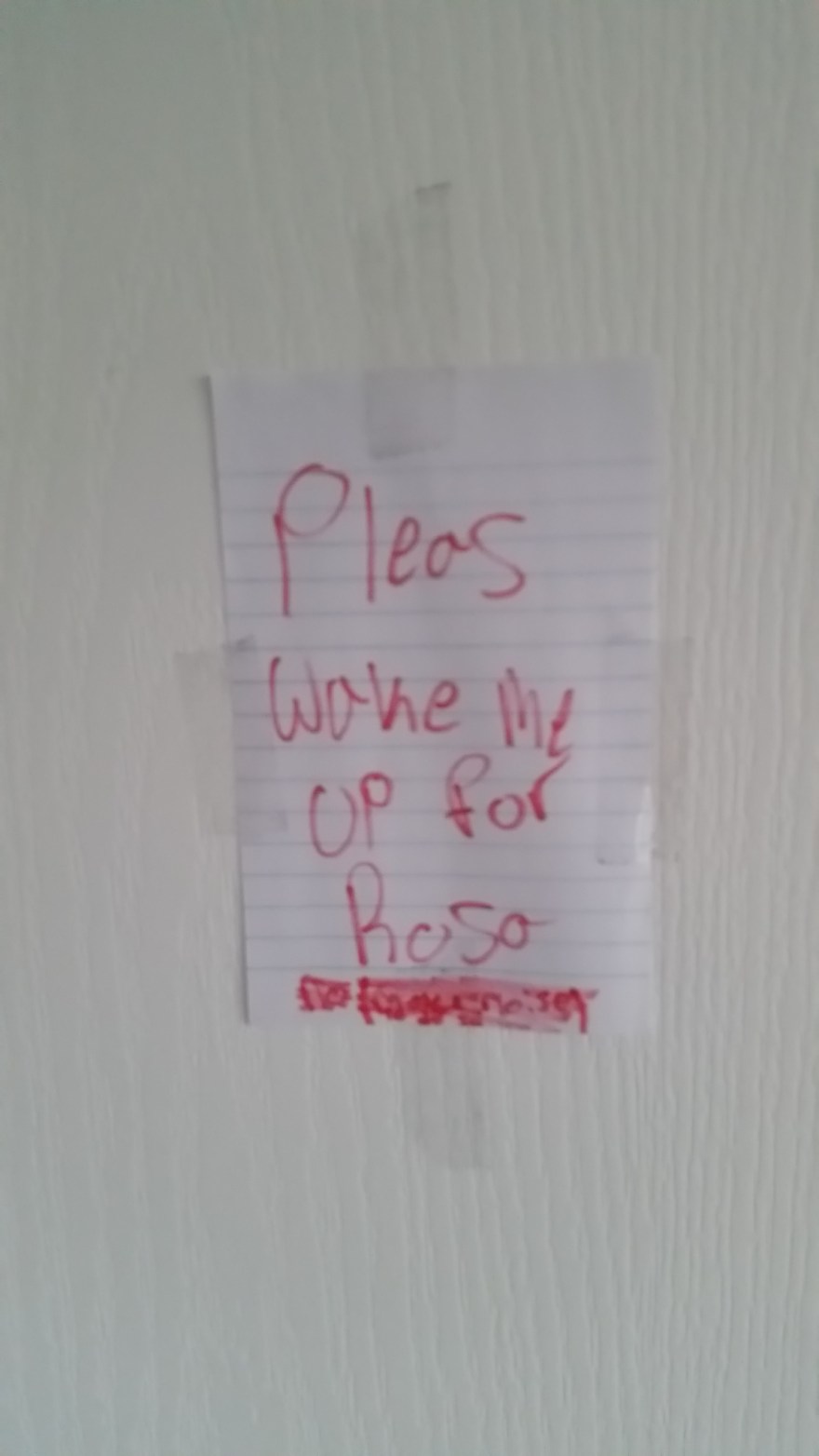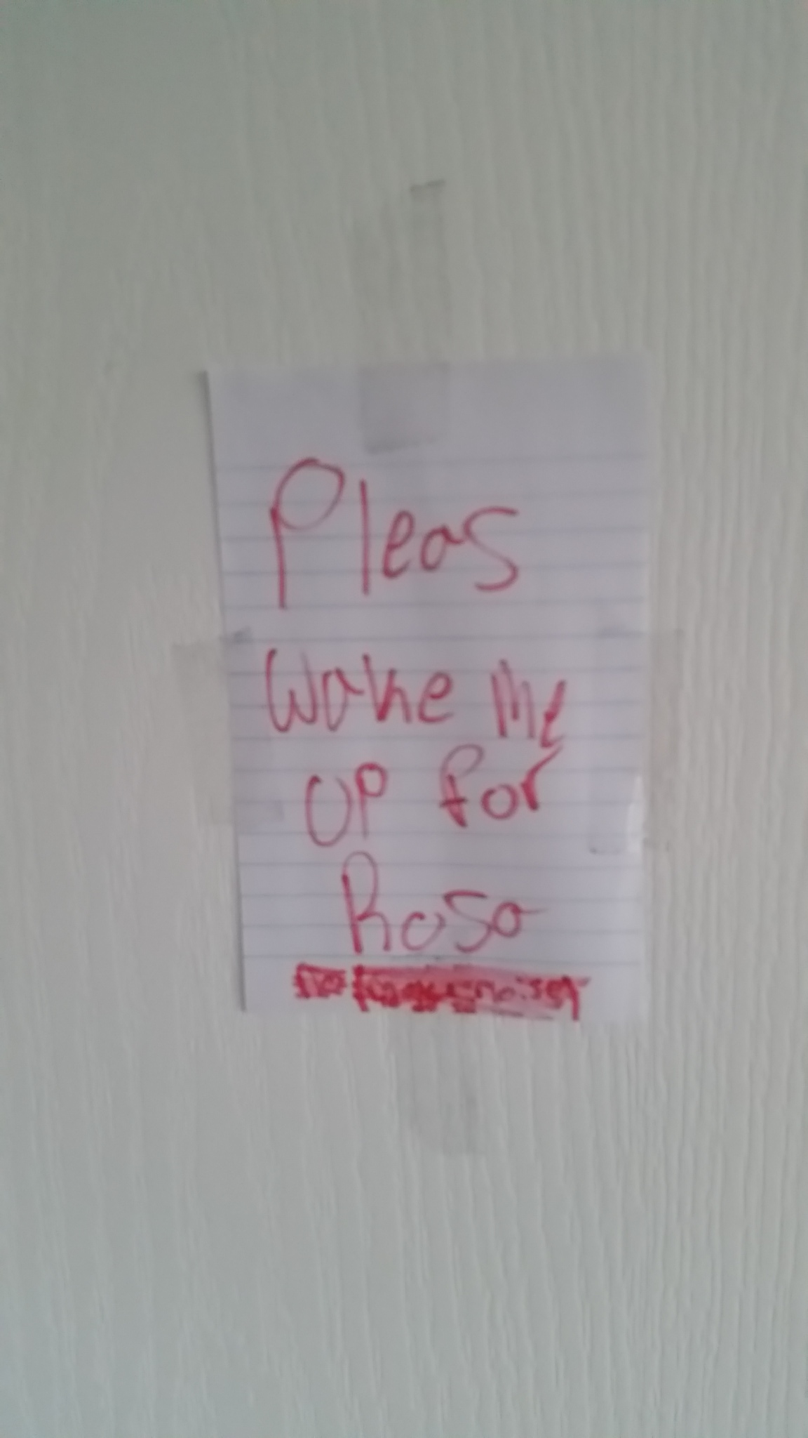 Roza Preparation Early wakeup instructions on the door. Share this: Click to share on Facebook (Opens in new window) Facebook Click to share on X (Opens in new window) X Like Loading... Posted on June 4, 2017